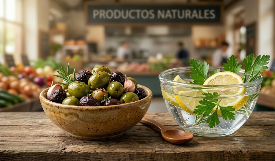 1. El Aceite de Oliva (AOVE): Es el antiinflamatorio natural más potente del mundo. El del súper suele ser una mezcla que ha perdido sus propiedades; el nuestro (disponible en varios puestos del mercado) conserva todos los polifenoles que «apagan» el fuego de tu tripa.